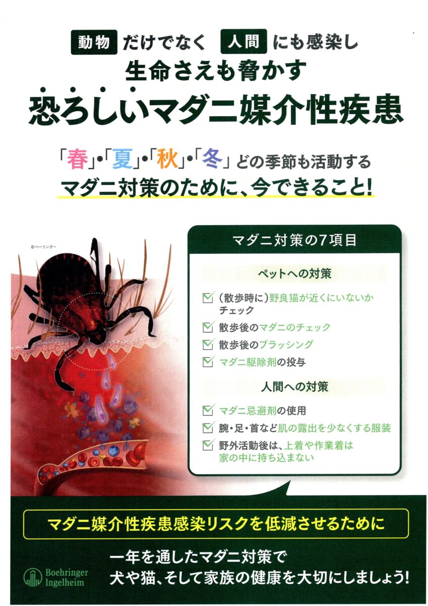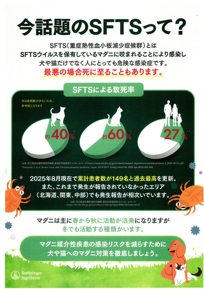 2月5日(木)21時から、会員病院獣医師とスタッフを対象に、ベーリンガーインゲルハイムアニマルヘルスジャパン株式会社の学術担当者を講師に迎えマダニが媒介する『重症熱性血小板減少症候群(SFTS)』についてのウェブセミナーを開催しました。2025年8月現在で累計の患者数(ヒト)が149名と過去最高を更新しています。また、夏だけでなく冬でも活動するダニもいます。堺市獣医師会会員病院では皆様の大切なペットだけでなく飼い主様とそのご家族の健康を守るため、最新の情報収集をしています。詳しくは会員病院にお尋ねください。